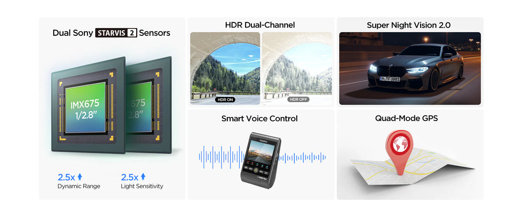 A229 Plus is the industry's first dashcam using two Sony STARVIS 2 IMX675 image sensors which offer 2.5 times wider dynamic range and higher light sensitivity than the STARVIS tech, bringing much less noise and motion blur during day & night recording.