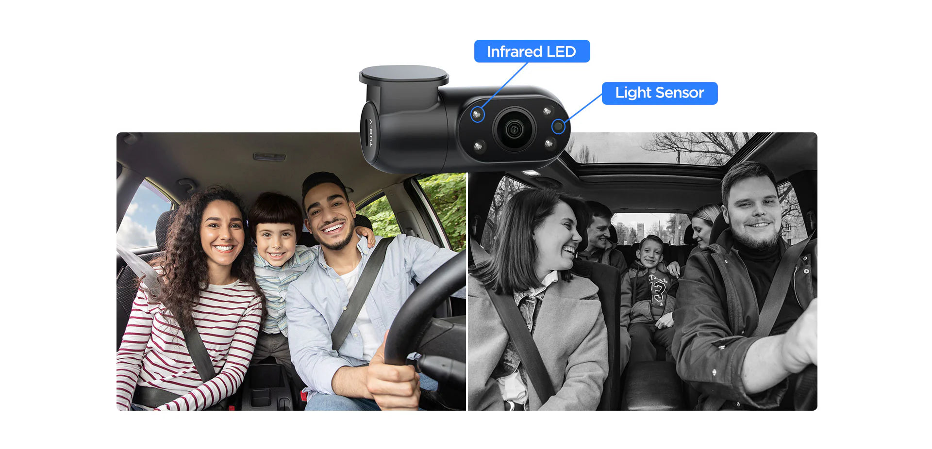 Equipped with a built-in IR light sensor, the interior camera automatically activates its 4 infrared LED lights in low-light conditions, ensuring sharp black and white image capture even in total darkness.