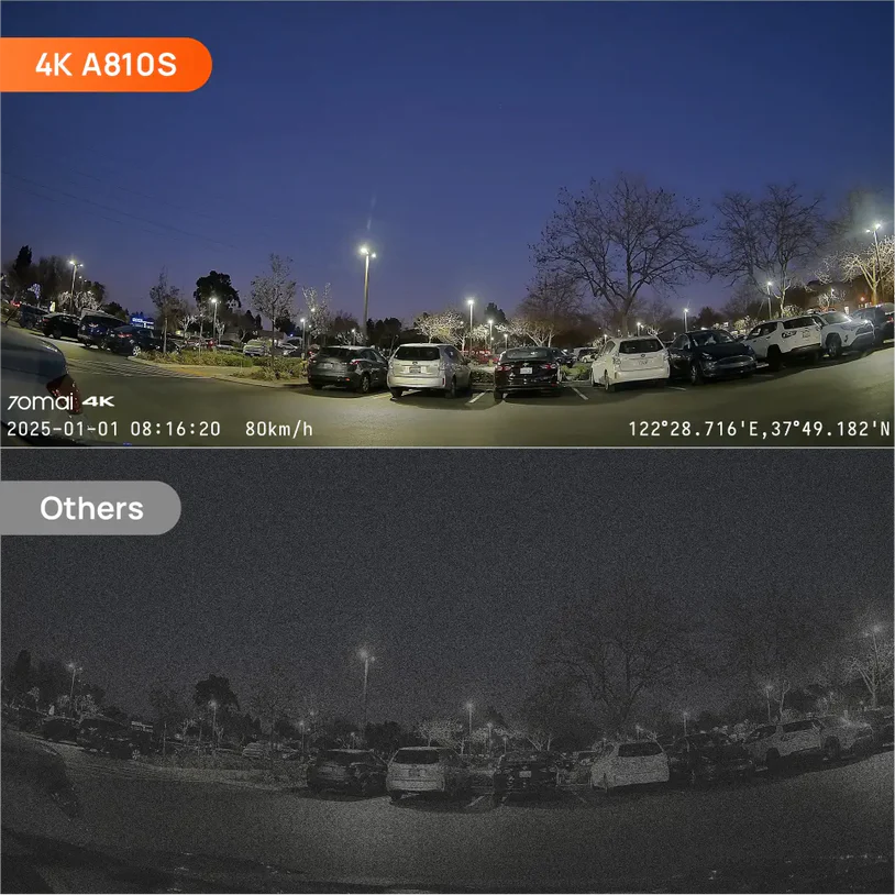 Even when parking in a pitch-black environment, the 4K A810S is also up for the challenge with 70mai Lumi Vision. This technology leverages what's found in professional film-making cameras, significantly prolonging exposure time and increasing ISO to generate daylight-level visibility.